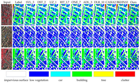 Visual quality comparison of the proposed model over other different methods on the Potsdam testing dataset.