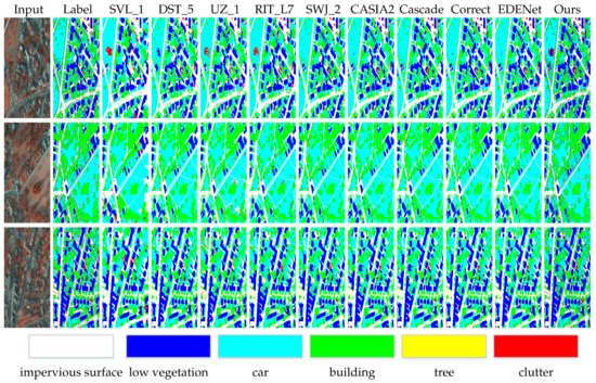 Visual quality comparison of the proposed model over other different methods on the Vaihingen testing dataset.