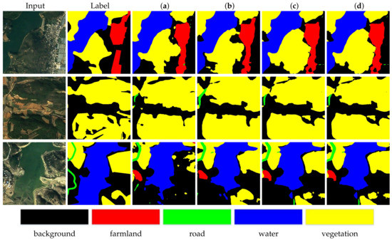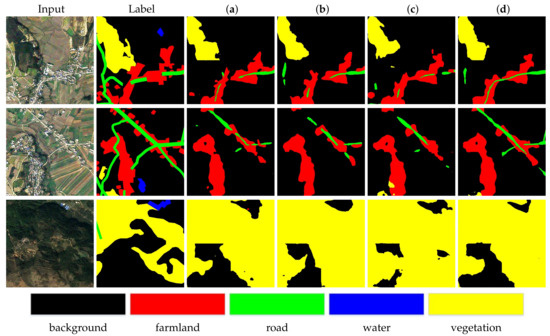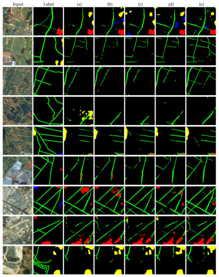 Visual comparisons are shown in Figure 7. The first column is the input and the second column is the the label of input. The third to sixth columns show the results from experiments a, b, c, and d. According to the visual results, EEM effectively extracts rich feature information especially with the help of canny and dilation operations. From the first row and second row, it shows the improvement of the edge extraction, especially on the road element. However, from the second row to third row, it can be seen that the proposed method still performs well when the context of remote sensing images become more and more complicated.