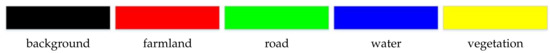 The Tianzhi Cup AI Challenge Dataset consists of a pair of 23 RSIs of 7400 × 4950 resolution and corresponding ground truth semantic labels. Each image contains three channels of red (R), green (G), and blue (B). Following the contest instructions, 12 of them are used for training, 6 of them are used as validation data, and the remaining RSI are used for testing.