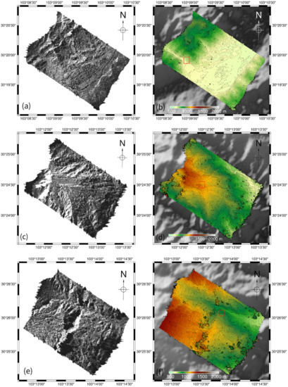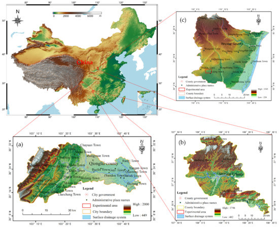 The three experimental sites include the Heyang, Shibing, and Qionglai areas. The Heyang experimental area is located in Heyang County, northwest of Weinan city, in the eastern part of Shaanxi Province. The longitude and latitude ranges of the experimental area are 110.061°E~110.096°E, 35.080°N~35.102°N and 3.19 km by 2.44 km. The altitude range is 546~705 m from the Shuttle Radar Topography Mission (SRTM) digital elevation model (DEM). The terrain of the experimental area is mainly plains, including towns and farmland. The Shibing experimental area is located in Shibing County in southeastern Guizhou Province. The longitude and latitude ranges of the experimental area are 108.184°E~108.185°E, 26.889°N~26.919°N and 14.99 km by 3.35 km. The altitude range is 560~1198 m. The terrain of the experimental area is relatively rugged, with mountains, towns, roads, farmland, forests, etc. The Qionglai experimental area is located in Qionglai city in the center of Sichuan Province. The longitude and latitude ranges of the experimental area are 103.140°E~103.283°E, 30.319°N~30.493°N and 21.27 km by 2.56 km. The altitude range is 603~1344 m. The terrain of the experimental area is rather rugged and undulating, with high mountains, towns, and farmland. The three experimental sites are shown in Figure 1.