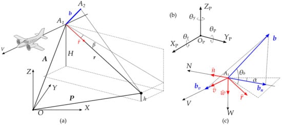 Three-dimensional geometry of airborne InSAR. (a) InSAR platform in the ECR coordinate system, (b) platform coordinate system, and (c) baseline vector in the MMC system.