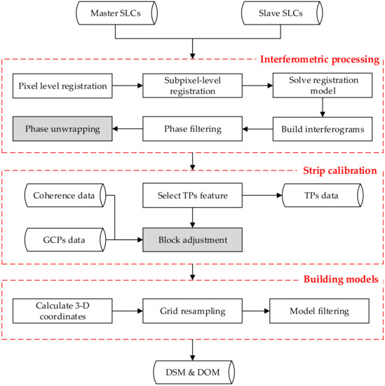 The main process of airborne InSAR data is divided into three parts, including interference processing within SLC scenes, global adjustment of interferometric parameters based on sparse GCPs and TPs between SLC scenes, and generation of a DSM and DOM based on the calibrated parameters. The processing flow chart for generating a DSM/DOM with airborne InSAR is shown in Figure 4.
