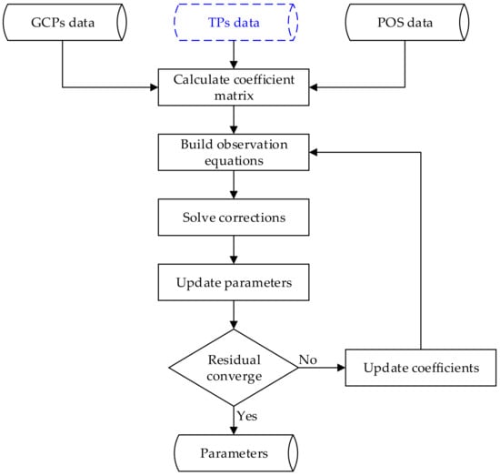 Based on the principle of least squares, the corrections of the three-dimensional coordinates of the TPs are carried out first when solving the normal equation to obtain corrections of the interferometric parameters of the system. Then, we apply the parameter corrections, and the coordinates of the TPs are solved. The model parameter is solved with an iterative and gradual scheme. The process of block adjustment is shown in Figure 6: