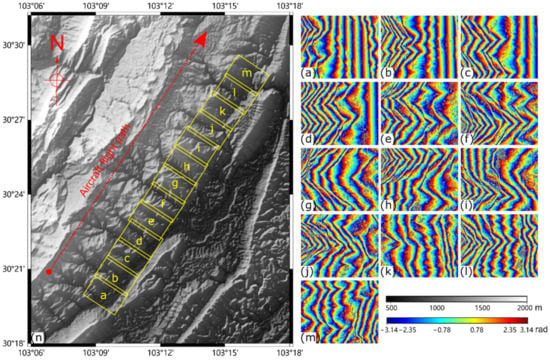 Scene coverage distribution of the Qionglai experiment (n), where a 30-m resolution DEM is taken as the base map, and filtered interferometric phase of the 13 scenes (a–m).