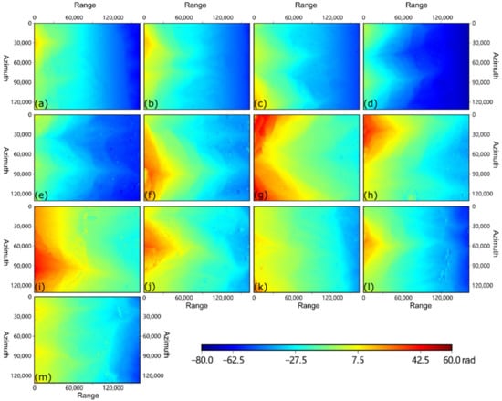 The 13 scenes of unwrapped phase data in the Qionglai experiment from the proposed PU method based on MBTs, (a–m) refer to unwrapped phase in scene a–m in Figure 7.