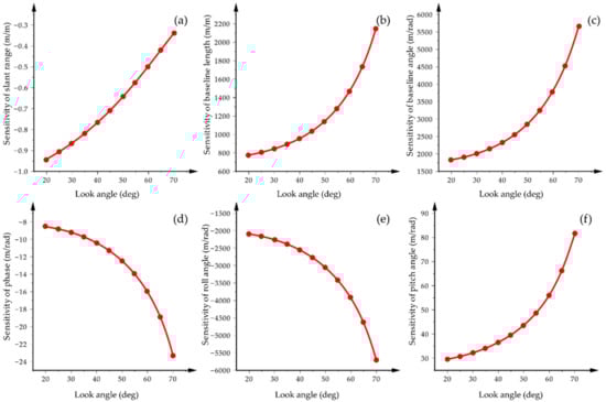 As shown in Figure 9, the sensitivity coefficients of the baseline length, baseline angle, and roll angle are approximately n × 103 with increasing look angles, far greater than those of the other parameters. Since the aircraft carries POS, the height of the master antenna phase center and the slant range can be accurately calculated, and the pitch angle error is of little effect and is ignorable in a single scene.