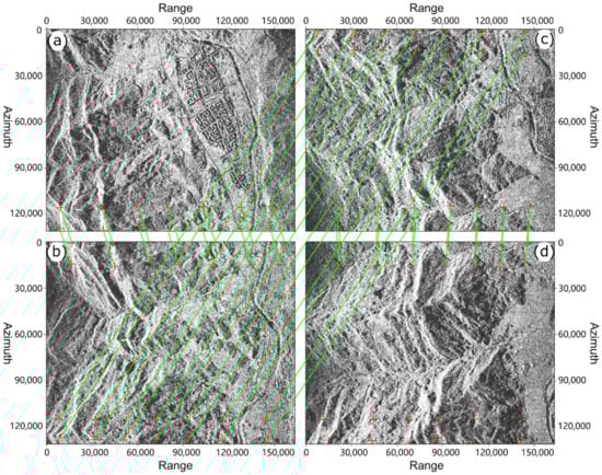 TPs (red crosses) and their connections (green lines) in the first 4 scenes of the Qionglai experiment, where (a–d) refer to the magnitude maps of the 4 scenes.