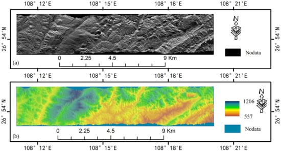 The obtained DOM (a) and DSM (b) of the Shibing experimental area.