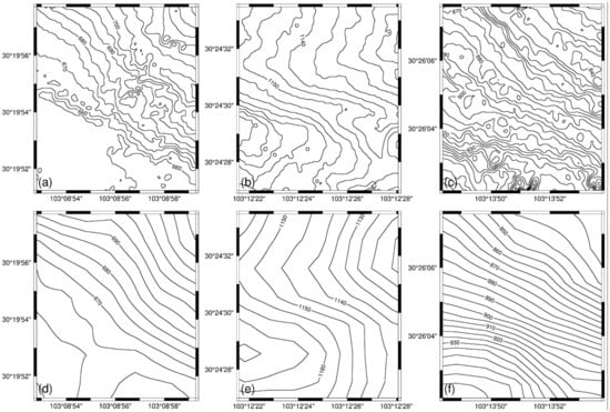 For local detail assessment of the obtained DSM, three window areas were selected, as marked in Figure 11b,d,f. The first area was located at the foot of a mountain, covering a gentle slope and flat land; the second area was at the top of a mountain, covering peaks, valleys, and ridges; and the third area was on a steep slope of a mountain. We extracted the corresponding DSM data to plot 5 m-interval contour lines and compared them with those from the SRTM data. As shown in Figure 15a, our DSM data provide more local detailed descriptions, with obvious bumps on the slope and more clear horizontal features in the flat area in the first area. Figure 15b presents a finer description of the mountain than the smooth contours of the SRTM, and a more detailed description of the slope compared to SRTM in Figure 15c.