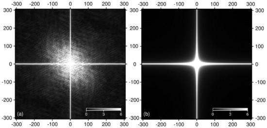 In consideration of the frequency spectrum analysis of DSM, we perform Fourier transform on the data of the second window area, 614 × 614 pixels. The SRTM DEM data are resampled due to differences in resolution. The frequency magnitude spectrum is shown in Figure 16. We found that the energy is more concentrated in the low-frequency portion for the SRTM data, while our DSM data have a more dispersive spectrum for their finer details.