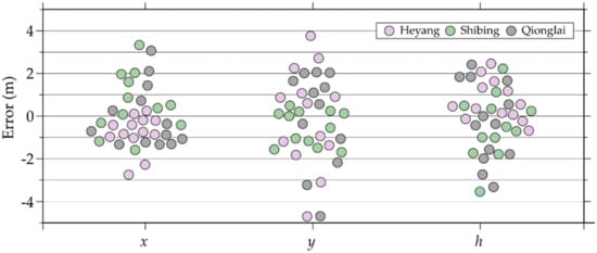 For geometric accuracy assessment, we performed model accuracy verification with GCPs. 13, 12, and 13 GCPs were used to calculate local horizontal coordinate errors and elevation errors in the x, y, and h directions in the three experimental areas. The error distribution in the three experimental areas is shown in Figure 17.