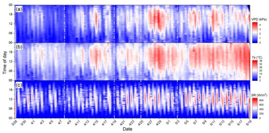 Overview of the meteorological conditions during the entire measurement campaign (from 28 March 2017 to 19 May 2017): (a) vapor pressure deficit (VPD, kPa), (b) air temperature (Ta, °C), and (c) solar radiation (SR, W/m2). White dash-dotted lines in panels (a–c) show several valleys of SR during the growing season.