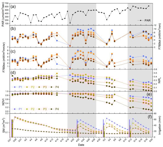 Seasonal patterns of (a) PAR, (b) F760tot, (c) F760toc, (d) NIRv, (e) NDVI, and (f) SM and irrigation. Each dot line represents the daily mean value of the measurements, with blue dots for plot 1 (P1) and orange to dark black for plots 2–4 (P2–P4). Gray transparent rectangles in panels (a–c) indicate the different response period of SIF and VIs to different drought levels.
