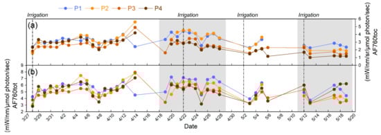 Additionally, the seasonal patterns of AF76toc and AF76tot (SIF/PAR, normalized by PAR) under different intensities of droughts were also analyzed. Overall, SIF/PAR showed similar trends of change with those of SIF (Figure 5); that is, its values for the four plots were generally directly proportional to the drought levels. Specifically, as shown in Figure 5a,b, the fluctuation of SIF/PAR was reduced after eliminating the effect of PAR on SIF. In the first rectangle of two irrigations, the AF760 values of the four plots were displayed in the order of P2 > P1 > P3 > P4 for AF760toc and P1 > P2 > P3 > P4 for AF760tot. In the second rectangle of the four irrigations, the AF760 values of the four plots were shown in the order of P1 > P2 > P3 > P4 for AF760toc and P1 > P4 > P2 > P3 for AF760tot.