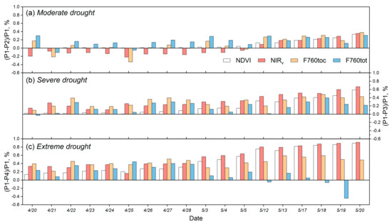 In order to further investigate the impact of F760tot on droughts, the drought-induced decreases, especially those caused by SM, in the NDVI, NIRv, F760toc, and F760tot between P1 and the other plots are explored in Figure 6. The theoretical basis for this analysis was that the field experiment took the SM as the control condition, and other properties such as the illumination, temperature, and wheat of the four plots were basically similar. Therefore, the differences for P1 and the other plots directly represented the impact of SM droughts on different variables. As shown in Figure 6, the drought-induced decreases of the four variables gradually increased along with the aggravation of the drought, ranging from 40% to 90%. In the same intensities of droughts, the drought-induced decreases of the four variables also gradually increased as the drought progressed, except for F760tot in an extreme drought.