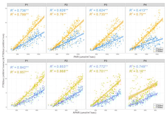 Relationship between hourly PAR, APAR, and F760toc (blue) or F760tot (golden) in the field campaign collected from four plots (P1–P4). The blue or golden lines with band denote the regression line and 95% confidence interval, respectively. Significance was performed according to two-tailed test (ns: p > 0.05. * p < 0.05. ** p < 0.01. *** p < 0.001).