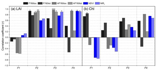 Partial correlation coefficients (r) of (a,b) with F760toc, F760tot, AF760toc, AF760tot, NDVI, and NIRv based on daily measurements. Significance was performed according to two-tailed test (ns: p > 0.05. * p < 0.05. ** p < 0.01. *** p < 0.001).