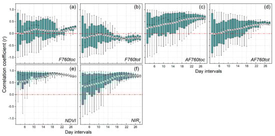 Boxplots of correlations between (a) F760toc, (b) F760tot, (c) AF760toc, (d) AF760tot, (e) the NDVI, (f) NIRv, and soil moisture in 20-cm soil layer from P4 with different day intervals. Each data represents the daily mean value of the measurements.