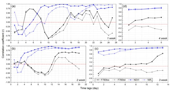 Correlations between F760toc, F760tot, NDVI, NIRv, and soil moisture in 20-cm soil layer from P4 with different time windows in time lags of (a) 1 week, (b) 2 weeks, (c) 3 weeks, and (d) 4 weeks. Note that 1–4 weeks represents the temporal resolution of data. The horizontal axis represents the number of days that soil moisture precedes SIF or VIs. Each datum represents the daily mean value of the measurements.