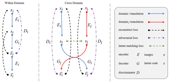 Based on the paired dataset, this study introduces the bidirectional reconstruction loss [29] to achieve the reversibility of the encoding and decoding processes and reduce the redundant function mapping space. Meanwhile, this study adopts the objective function to make all encoders output to the same latent space, and the images of various spectral domains can be reconstructed from the latent space. Figure 2 shows the training flow of the loss function for with-domain and cross-domain.