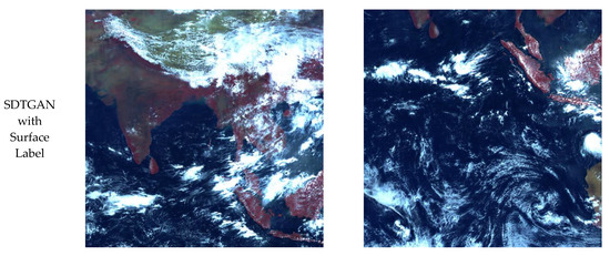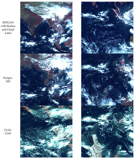 The spectral translation task involves the transformation of energy intensity and graphic texture. In most cases, the model can generate plausible cloud and continental shapes. However, there are still many cases in which the model causes loss of details and distortions. As shown in Figure 6a, in the real image, the ocean is covered with large areas of thin clouds, yet. The generated image has difficulty in inferring the random phenomenal changes over a large area, thus yielding an erroneous result. As shown in Figure 6b, in continental terrain, a certain distortion and blurring is produced for the boundary areas with variable shapes.