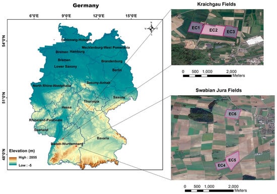 - Weber, T.K.D.; Ingwersen, J.; Högy, P.; Poyda, A.; Wizemann, H.-D.; Demyan, M.S.; Bohm, K.; Eshonkulov, R.; Gayler, S.; Kremer, P.; et al. Multi-Site, Multi-Crop Measurements in the Soil-Vegetation-Atmosphere Continuum: A Comprehensive Dataset from Two Climatically Contrasting Regions in South West Germany for the Period 2009–2018. Earth Syst. Sci. Data Discuss. 2021, 1–32. [Google Scholar] [CrossRef]