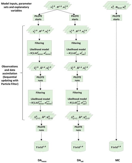 - The third large source of uncertainty lies in the structure of crop models and the parameters relating the assimilated state variable to the target variable, in our case grain yield. Data assimilation may significantly improve the prediction of the assimilated variables but not necessarily the prediction of grain yield. The model structural link between LAI and biomass, for example, is commonly strong, but this is less so for grain yield [32]. Also, the time at which LAI information is available, relative to harvest, has an impact. For example, soil moisture and LAI available during the early growing season may be less important for yield forecast accuracy than data available in the mid or late growing season. A weak correlation between assimilated variables and yield, which may be the result of model structure or parameterization or both, does not lead to improved yield prediction even if the uncertainties previously mentioned are fully accounted for. In other words, the crop variable used for data assimilation should contain information about the uncertainty of the parameters and affect the yield [33]. Model structure is also important since the input uncertainty propagates to yield prediction through crop model equations and parameters. Complex, process-based models can explain many processes in detail and provide the dynamics of many state variables, provided that the required inputs are available. However, in the absence of large-scale agronomic and soil data, simple models with fewer parameters may be more useful, e.g., the PILOTE model [34,35], which we will employ here, or others such as SAFY [36]. PILOTE simulates LAI as a function of temperature and soil water balance using empirical equations. It then computes biomass from LAI, incoming radiation, and radiation use efficiency.