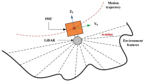 The research object of this paper is a measurement system composed of a multiline LiDAR and an IMU, in which the LiDAR and IMU are fixedly connected. The system can realize the synchronous measurement of the geometric features of environment (LiDAR) and the motion information (IMU) of the carrier (Figure 1).
