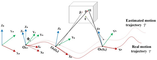 where and represent the measured coordinates of correspondence ) and and are LiDAR position errors at measurement times and . Substituting Equation (7) into Equation (9), the registration error can be expressed as a function of IMU error , , . Equation (9) establishes the relationship between the point cloud registration error and the parameters of the inertial trajectory error model.