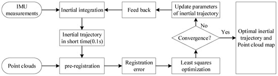 We design the technical route of the IMU-aided MLS registration algorithm. Our algorithm is mainly divided into four steps. (1) Construct an inertial trajectory over a short time period through inertial integration and convert the MLS point cloud to the c-frame. (According to the description in Section 3.1.2, “short time period“ here is treated as 0.1 s.) (2) Construct point cloud correspondences based on the inertial trajectory constraints. (3) By minimizing the point cloud registration error through the least squares method, we realize the registration of multi-frame point clouds, and we obtain the IMU trajectory error model parameters to correct the trajectory. (4) Judge whether the algorithm converges. If not, proceed with the next iteration. Finally, a locally-optimal IMU trajectory and a locally-consistent point cloud map are obtained. The algorithm flow chart is shown in Figure 3.