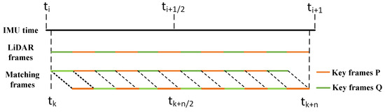 For the registration method based on nearest neighbor search, the initial estimates and overlap degree directly determine the convergence speed and robustness. Before registration, we use the inertial trajectory as the initial estimates, and then transform the point cloud in the l-frame at different times to the c-frame using the trajectory, so that the distance between initial correspondences is as close as possible, and the iteration times will be effectively reduced. In the registration process, we propose the cross-matching strategy. As shown in Figure 4, in the time period , the point cloud scan frames (as shown in “LiDAR frames” in the figure) are divided into and according to equal time intervals (0.1 s), which are represented by orange and green respectively. However, during registration process, since the LiDAR is constantly moving, adjacent and may not have a high overlap rate, resulting in registration failure. In order to ensure a high overlap rate during registration, as shown in the “Matching frames” in the figure, and are re-synthesized into new point clouds, one of which contains and in time period , and the other frame contains and in time period . Through this cross-registration strategy, a high overlap rate between two matching frames is achieved, so that the ICP algorithm can be used to find correspondences. This strategy can ensure that the scan frames to be registered have high overlap in any scene and at any time, so the robustness of matching can be guaranteed. Since the scenes in and are similar, the overlap can achieve 90%, and we usually regard 20% correspondences with the largest distance as outliers and discard them. Furthermore, the correspondences whose distance exceeds a certain threshold (we set to 2 m) are eliminated.