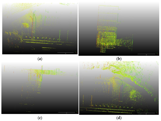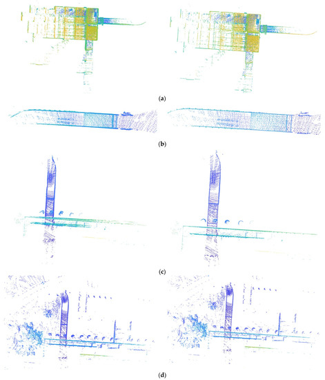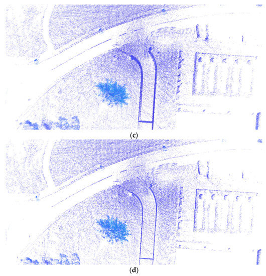 Comparison of a local magnification of the submaps in scene 5. (a) The local magnification of the submap in scene 5 with the ICP method. (b) The local magnification of the submap in scene 5 with the NICP method. (c) The local magnification of the submap in scene 5 with the IMU-aided ICP method. (d) The local magnification of the submap in scene 5 with our method.