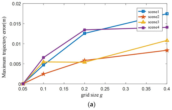 By setting different parameters, submaps and trajectories within different periods of time can be obtained. We evaluated the influence of different parameters by comparing the trajectory difference after submap registration. As shown in Figure 9a, the maximum influence of parameter g on the trajectory is approximately 1.5 cm. Therefore, our method is insensitive to the choice of point cloud density. When accuracy requirement is not high, the density of the point cloud can be reduced to increase calculation speed.