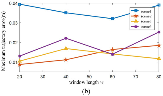 To find the optimal setting of w, we select different window lengths for the IMU-LiDAR data fusion and obtain trajectories of different lengths. Taking the trajectory of the 80-frame window as a benchmark, we calculate the distance between trajectories of different window lengths and the benchmark, and the maximum difference is shown in Figure 9b. The trajectory error of different window lengths is stable within a certain parameter range, generally approximately 2 cm, and the maximum trajectory difference is 4 cm, which is equivalent to the range accuracy of the LiDAR, so the results indicate that the registration error is sensitive to different scenes rather than parameter settings.
