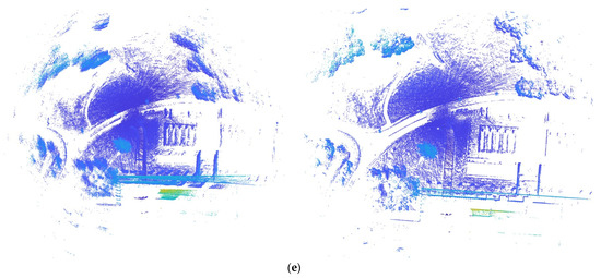 We first compare the registration accuracy between two adjacent frames. In the above five scenes, two adjacent frames of the point clouds are selected for registration, and the RMS is calculated (Equations (13) and (14)). It should be noted that in the traditional ICP method, the error is large without providing initial estimates, and the ICP method fails to converge. In contrast, our performance is good due to the assistance of the IMU. Due to the above situation, to make a quantitative comparison, we use the initial IMU integration trajectory as the initial estimates for the ICP method and then compare the ICP method with accurate initial estimates and our method.