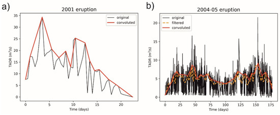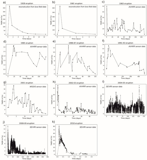 - Harris, A.; Steffke, A.; Calvari, S.; Spampinato, L. Thirty years of satellite-derived lava discharge rates at Etna: Implications for steady volumetric output. J. Geophys. Res. 2011, 116, B08204. [Google Scholar] [CrossRef] [Green Version]