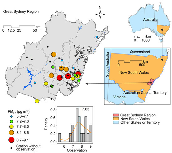 In the Greater Sydney Region, there are 34 monitoring stations for different types of air pollutants, such as PM, PM, SO, NO, and O [45]. The number of stations has been continuously increased in recent years to cover more typical areas and improve the capacity to monitor air pollution. The number of PM monitoring stations has been increased from 15 in 2018 to 19 in 2020. In this study, the annual mean PM concentrations at the 19 valid stations in 2020 are used to predict the spatial distribution of annual mean concentrations in Greater Sydney Region (Figure 1). PM is the fine particulates with the size smaller than 2.5 m in aerodynamic diameter [46,47]. PM is a mixture, and its components are sophisticated and varied in different locations. The potential sources of PM primarily consist of traffic [48,49,50], industrial activities [51,52], bushfire [53], residential energy use and biomass burning [54,55], and agricultural products and straw burning [56]. The map shows that the general spatial pattern of PM concentrations is that PM in urban regions (southeastern regions) tend to be higher than that in rural regions. The distribution pattern and rural–urban difference of PM indicate that, from the spatial perspective, PM is closely associated with traffic and other human activities. Table 1 shows the statistical summary of PM observations. The concentrations at the 19 stations range from 5.60 to 9.10 g m, and the mean value is 7.83 g m.