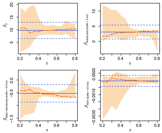 where is the th conditional quantile of the response variable Y [21,22], is the jth () explanatory variable with the optimal buffer , and are coefficients of the th quantile of explanatory variables. The process of quantile-regression-based parameter estimation includes the following steps. In each quantile, the model is fitted using a linear programming method [72]. When the quantile is set to different values, corresponding estimates of for different quantiles can be computed. In this study, to effectively present the comprehensive association between dependent and independent variables, all percentiles, i.e., 100 quantiles, are used as quantile points for modelling. This processing is consistent with most studies about quantile regressions and can reflect details of small data sample distributions.