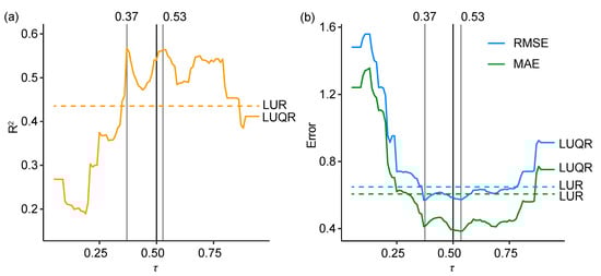 Table 3 shows a comparison between the LUQR and LUR models using an LOOCV approach. In general, the LUQR model has a higher LOOCV goodness-of-fit than the LUR model and has lower prediction errors than the LUR model. Compared with the LUR model, the goodness-of-fit is improved by 25.6%, and the RMSE and MAE are reduced by 10.6% and 22.7%, respectively, by the LUQR model with . In addition, the LUQR model with and can improve the goodness-of-fit of the LUR models by 32.1% and 31.2%, respectively, reduce RMSE by 13.4% and 12.6%, respectively, and reduce MAE by 19.4% and 24.7%, respectively. As R may not have a sensible interpretation in quantile regression [73], prediction error indicators RMSE and MAE can more effectively indicate the accuracy improvement of the LUQR models than R. In summary, predictor error indicators RMSE and MAE can be reduced by 10.6–13.4% and 19.4–24.7% by the LUQR models, respectively, compared with the LUR model. Thus, the LUQR model with is the optimal model among LUQR model with all three quantile parameters.