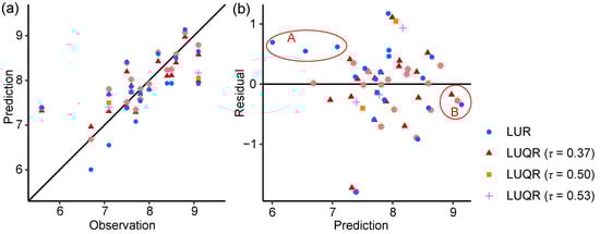 Comparison of LOOCV results between LUR and LUQR models: relationship between observations and predictions of PM concentrations in LOOCV (a) and relationship between predictions and residuals of PM concentrations in LOOCV (b).