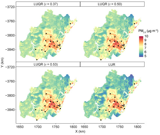 Spatial predictions of PM concentrations using LUQR ( = 0.37), LUQR ( = 0.50), LUQR ( = 0.53) and LUR models.