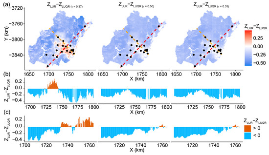 Spatial distributions of the difference between LUR-based prediction () and LUQR-based prediction () (a), and transect along red (b) and orange (c) lines. (“Z” is predictions of models).