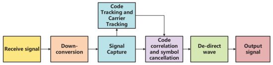 Since there is no reference channel for the FSR system, it is necessary to perform preprocessing on the received signal before radar processing. The preprocessing flow chart is shown in Figure 3 [23]. In the tracking loop, the code phase and the carrier spectrum are accurately estimated by the code tracking loop and the carrier tracking loop, respectively. I/Q demodulation is often used to realize the tracking loop. According to [24], code correlation and symbol elimination are performed on the received signal after the down conversion, and the correlation result after signal processing can be obtained as