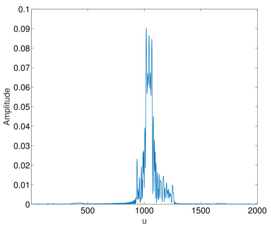 The signal distribution before the multipath interference suppression in the LCT domain is shown in Figure 6. In Figure 6, u represents the LCT domain. Fourier transform and fractional Fourier transform are special forms of LCT, so LCT domain can be regarded as the unity of time domain, frequency domain, and fractional Fourier domain, and contains the information of signal in time domain and frequency domain. Since most of the energy of the echo signal is concentrated in a narrow band centered at the peak point of the linear canonical transform domain, the Gaussian noise does not have good energy concentration in the LCT domain. It can also be seen that the energy distribution of multipath interference is on both sides of the LCT domain; therefore, the peak point can be used as the center of the rectangular window function to filter out the noise and interference.