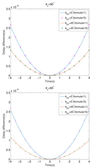 Based on (15), the time delay difference in the case of forward scatter can be calculated. The exact expression (11) and the approximate expression (15) are used to calculate the time delay difference, and the simulation results are shown in Figure 8 and Figure 9. It can be seen that the curves can be described by different equations. It also shows that the above simplification is effective, which can provide theoretical support for the target sensing and target parameter estimation. From Figure 8, we can see that the influence of the speed direction angle on the delay difference is very small. Assuming that the target does not cross the baseline and the horizontal distance from the baseline when crossing the plane is 50 m, the simulation is shown in Figure 9. It can be seen from Figure 9 that the delay difference in both cases are very close, and hence this paper only considers the case when the target crosses the baseline.