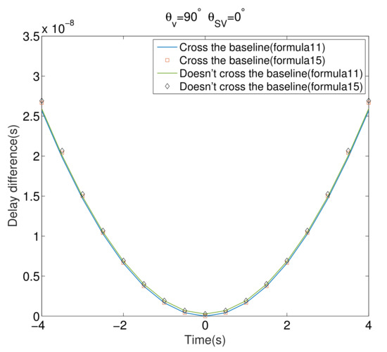 where L denotes the baseline length at . Under the assumption of plane waves, ; therefore, the delay difference can be written as