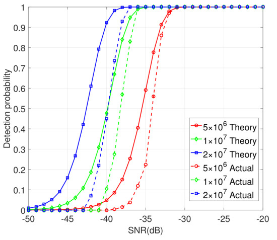 In order to evaluate the influence of sampling points on the sensing performance, the parameters are set as follows: the sampling frequency is MHz, the false alarm probability is , the GPS direct wave power is dBm, the symbol rate is MHz, the carrier frequency is GHz, the aerial target altitude is 10 km, the flight speed is 100 m/s, the average power of the echo signal is dBm; 2000 Monte Carlo simulations are used.
