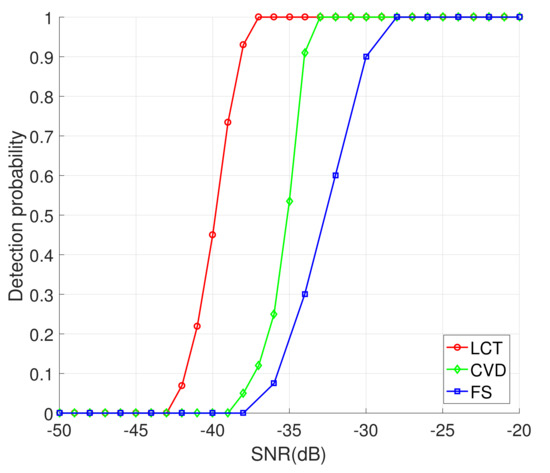 It can be seen in Figure 13 that, as the false alarm probability increases, so does the target sensing performance under the same conditions. When the false alarm probability is , the sensing performance can reach with SNR = −37 dB, and when the false alarm probability is , the sensing performance under SNR = −35 dB can reach , and when the false alarm probability is , the sensing performance can reach with SNR = −34 dB.