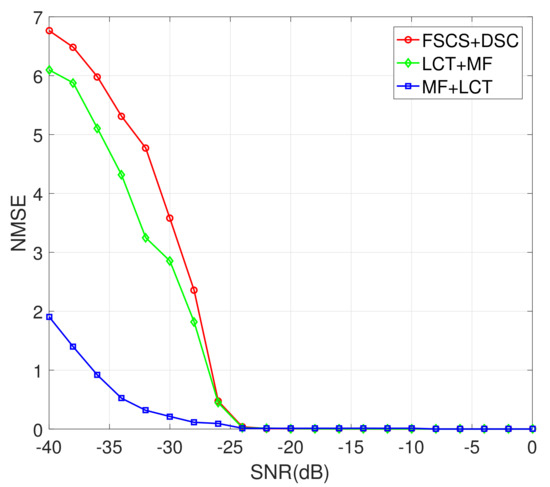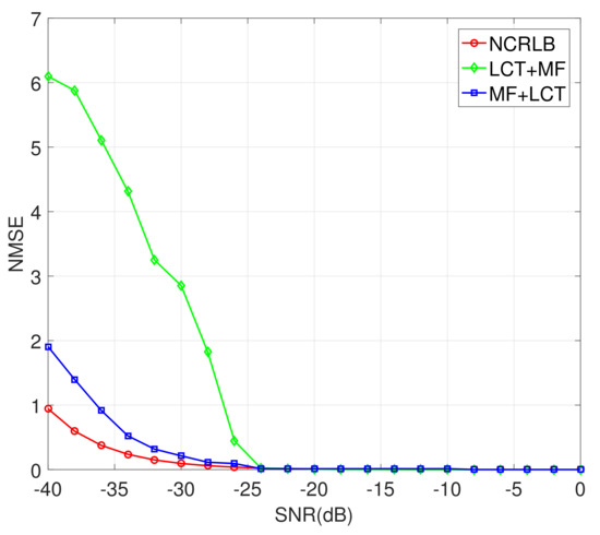 As can be seen from Figure 15, both the proposed LCT+MF method and the proposed MF+LCT method in this paper can achieve good estimation performance for the target flight altitude, and they improve as the signal-to-noise ratio (SNR) increases. This is because the increase in the SNR makes the corresponding peaks during parameter estimation more prominent, thereby improving the parameter estimation performance. The normalized minimum mean square error of the height estimation achieved by the LCT+MF method reaches when SNR = −17 dB and the estimation performance of the MF+LCT method reaches when SNR = −21 dB. From the above, the proposed methods have good estimation performance, which shows that the aerial target parameter estimation methods have good interference suppression effect.